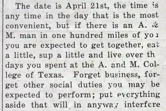Each year on April 21, at more than 200 locations around the world, current and former students of Texas A&M gather for camaraderie and to honor those who have passed away in the previous year.